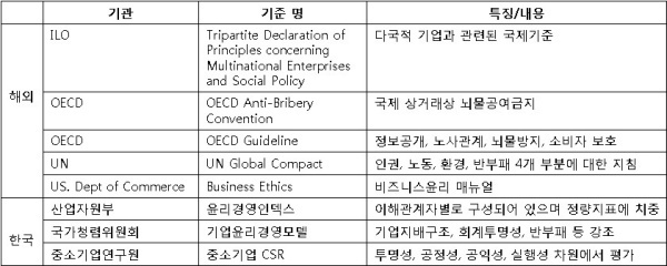지난 1977년 국제노동기구(ILO)가 ‘다국적 기업의 원칙과 사회정책에 관한 삼자선언(Tripartite Declaration of Principles concerning Multinational Enterprises and Social Policy)’을 통해 다국적 기업이 지켜야 하는 국제적 기준을 처음 제시했다. 이후 외국에서는 UN, OECD, 미국정부 등이 한국에서는 산업자원부(현재의 지식경제부), 국가청렴위원회, 중소기업연구원 등에서 윤리경영에 관한 가이드라인을 개발했다. 다음 표 1에서 관련 내용을 정리해 보자.