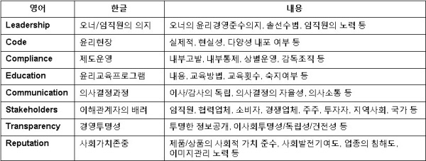 8-Flag Model의 8가지 핵심 상위지표는 오너/임직원의 의지(Leadership), 윤리헌장(Code), 제도운영(Compliance), 윤리교육프로그램(Education), 의사결정과정(Communication), 이해관계자의 배려(Stakeholders), 경영투명성(Transparency), 사회가치존중(Reputation) 등이다. 개별 상위 지표의 하위 지표를 정리하면 아래 표 2와 같다.