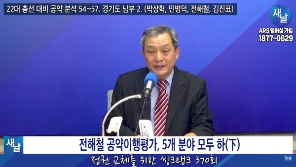 2024년02월20일(화요일) 새날 유튜브 방송은 2020년 21대 국회의원 선거에서 당선된 경기도 안산시 상록구갑 전해철 의원이 제시한 선거공약을 평가했다. 평가를 위한 방송에는 푸른나무, 이상구 원장, 민진규 소장(국가정보전략연구소)이 출연했다.