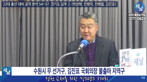 2024년02월20일(화요일) 새날 유튜브 방송은 2020년 21대 국회의원 선거에서 당선된 경기도 수원시무 김진표 의원이 제시한 선거공약을 평가했다. 평가를 위한 방송에는 푸른나무, 이상구 원장, 민진규 소장(국가정보전략연구소)이 출연했다.