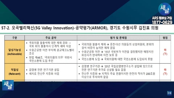 [국회의원 공약 평가] 57. 새날 방송, 경기도 수원시무 김진표 의원···합리성 중(中)외 4개 부문 모두 하(下)