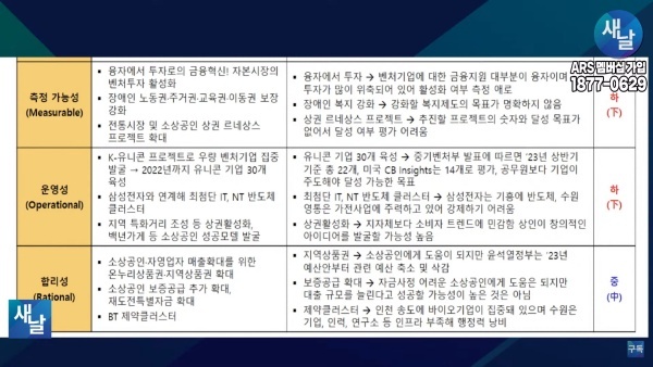 넷째, 운영성(Operational) 측면에서 보면 유니콘 기업 30개 육성을 공약했지만 중기벤처부 발표에 따르면 ’23년 상반기 기준 총 22개, 미국 CB Insights는 14개로 평가하여 목표는 달성되지 않았습니다. 유니콘 기업의 육성은 공무원보다 기업이 주도해야 달성 가능한 목표라서 운영성이 하로 평가되었습니다.
