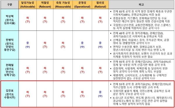 전체적으로 경기도의 주요 도시들인 이들 지역구의원의 공약을 보면 지역 발전이나 공약의 실효성이 낮은 것들이 대부분이라 다수이 공약들이 <하>로 평가되었습니다.