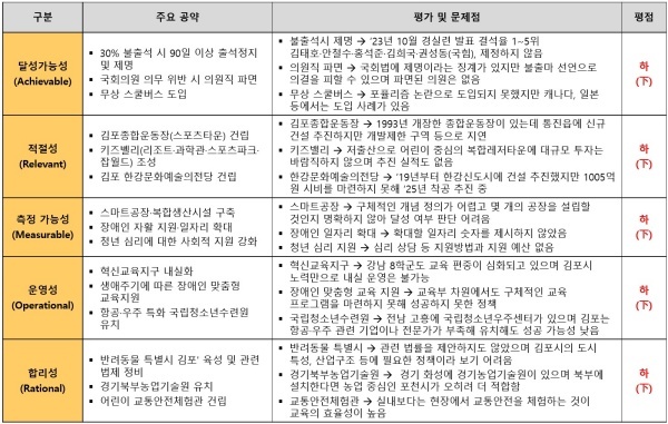 ▲ 경기도 김포시을 박상혁 의원 공약 평가 결과(달성가능성/적절성/측정가능성/운영성/합리성) [출처=국가정보전략연구소(iNIS)]