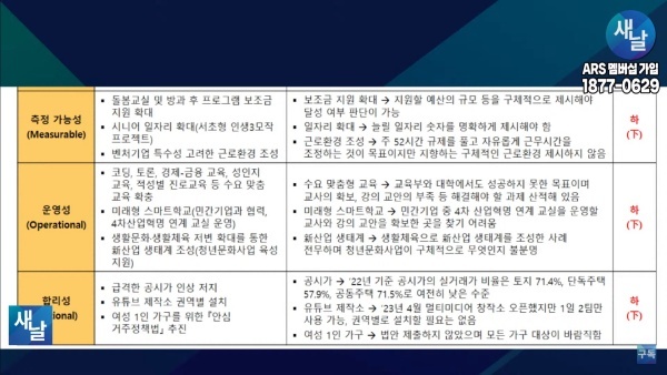 셋째, 측정 가능성(Measurable) 측면에서 보면 돌봄교실 및 방과 후 프로그램 보조금 지원 확대 공약의 경우 지원할 예산의 규모 등을 구체적으로 제시해야 달성 여부 판단이 가능합니다. 그런데 총선을 앞두고 예산도 확보하지 않은 상태에서 초등학교 종일 돌봄사업 실시를 발표하여 실행 여부가 불투명한 상황입니다.