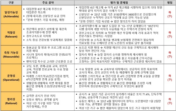 박 의원이 제시한 76개 공약은 △달성가능성 △적절성 △측정가능성 △운영성 △합리성 영역 등 5개 영역 모두 최하인 하(下) 평점을 받았다.