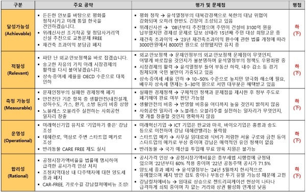 ▲ 서울시 강남구갑 태영호 의원 공약 평가 결과(달성가능성/적절성/측정가능성/운영성/합리성) [출처=국가정보전략연구소(iNIS)]
