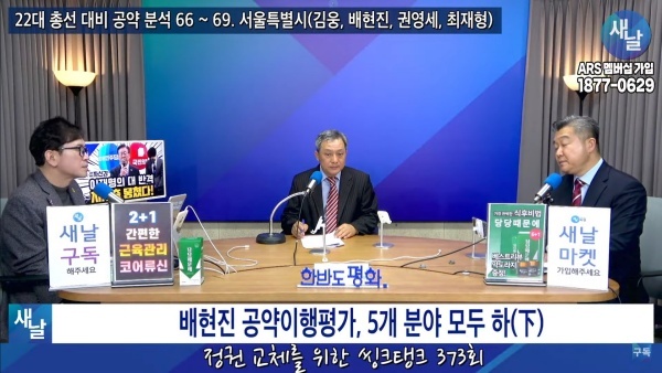 2024년03월12일(화요일) 새날 유튜브 방송은 2020년 21대 국회의원 선거에서 당선된 서울시 송파구을 배현진 의원이 제시한 선거공약을 평가했다. 평가를 위한 방송에는 푸른나무, 이상구 원장, 민진규 소장(국가정보전략연구소)이 출연했다.