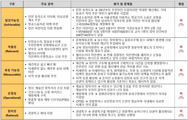 배 의원이 제시한 24개 공약은 △달성가능성 △적절성 △측정가능성 △운영성 △합리성 영역 등 5개 영역 모두 최하인 하(下) 평점을 받았다.