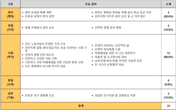 정책 공약 중 정치(행정)(4)·경제(산업)(2)·사회(복지)(12)·문화(교육)(0)·과학(기술)(2) 등···사회(복지) 공약이 전체의 60.0% 차지
