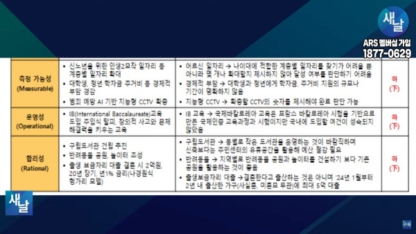 셋째, 측정 가능성(Measurable) 측면에서 보면 어르신을 위한 인생2모작 일자리 등 계층별 일자리 확대 공약의 경우, 어르신들의 전문성과 경험을 맞춘 일자리를 찾기가 어려울 뿐 아니라, 몇 개나 제공할지 제시하지 않아 달성 여부를 판단하기 어려운 공약입니다.