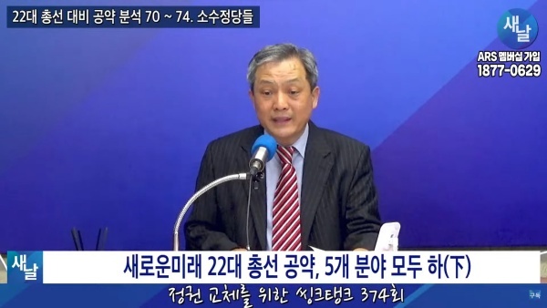 2024년03월26일(화요일) 새날 유튜브 방송은 2024년 22대 국회의원 선거를 위해 새로운미래가 제시한 선거공약을 평가했다. 평가를 위한 방송에는 푸른나무, 이상구 원장, 민진규 소장(국가정보전략연구소)이 출연했다.