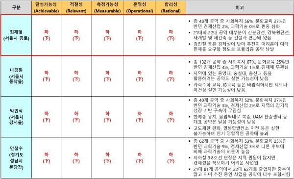 최재형 후보가 제시한 48개 공약은 △달성가능성 △적절성 △측정가능성 △운영성 △합리성 영역 등 5개 영역 모두 최하인 하(下) 평점을 받았다.