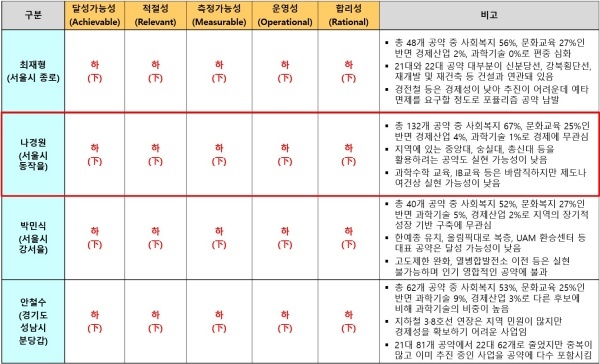 나경원 후보가 제시한 132개 공약은 △달성가능성 △적절성 △측정가능성 △운영성 △합리성 영역 등 5개 영역 모두 최하인 하(下) 평점을 받았다.