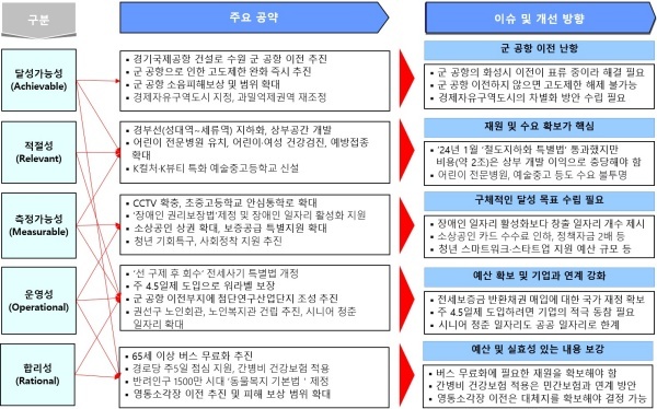 염태영 당선자가 제시한 52개 공약을 △달성가능성 △적절성 △측정가능성 △운영성 △합리성 영역 등 5개 영역으로 분석했다.