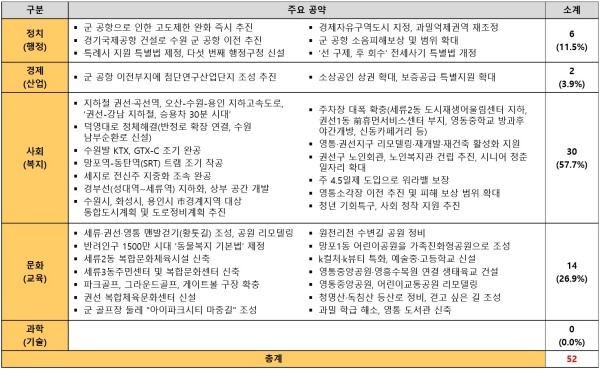 염태영 당선자가 제시한 52개 공약을 △달성가능성 △적절성 △측정가능성 △운영성 △합리성 영역 등 5개 영역으로 분석했다.