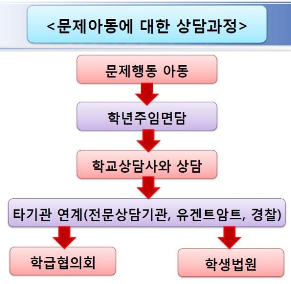 ◯ 상담소의 역할은 학생의 진로, 직업선택, 학습능률, 행동장애, 학교 폭력, 따돌림 등과 같은 문제, 기타 가족문제 등 전반적인 학생의 문제를 다루고 있다. 여기서 주목할 사실은 학생들의 모든 문제를 학교상담사가 다 해결하지 않는다는 것이다.