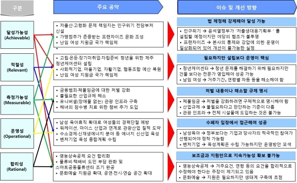 김한규 의원의 공약을 국정연이 개발한 갑옷(ARMOR), 즉 달성 가능성(Achievable)·적절성(Relevant)·측정 가능성(Measurable)·운영성(Operational)·합리성(Rational) 지표를 적용해 평가했다. 간략한 내역과 개선방안을 정리하면 다음과 같다.