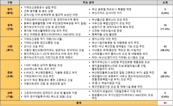 정치(행정) 공약은 △가덕도신공항공사 설립 추진 △건축 용적률 및 용도 상향 △공익사업 이주·생계대책 및 합리적 보상안 마련 △부산 글로벌 허브도시 특별법 제정 △부산구치소 강서이전 저지 등 5개다.