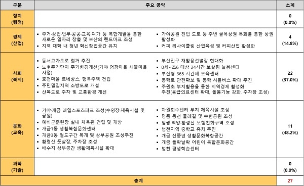 문화(교육) 공약은 △가야·개금 레일스포츠파크 조성(수영장·체육시설 및 공원) △예비군훈련장 실내 체육관 건립 및 개방 △배수지 상부공간 생활체육시설 확대 △범천지역 중학교 유치 추진 △범천 평생학습센터 등 13개다.