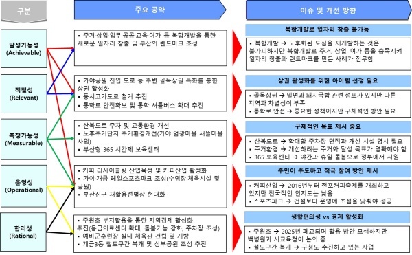 달성 가능성은 4년 임기 내에 완료할 수 있는지를 평가하며 주거·상업·업무·공공·교육·여가 등 복합개발을 통한 새로운 일자리 창출 및 부산의 랜드마크 조성을 판단했다.