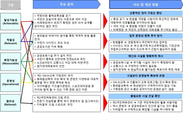 서지영 의원의 공약을 국정연이 개발한 갑옷(ARMOR), 즉 달성 가능성(Achievable)·적절성(Relevant)·측정 가능성(Measurable)·운영성(Operational)·합리성(Rational) 지표를 적용해 평가했다. 간략한 내역과 개선방안을 정리하면 다음과 같다.