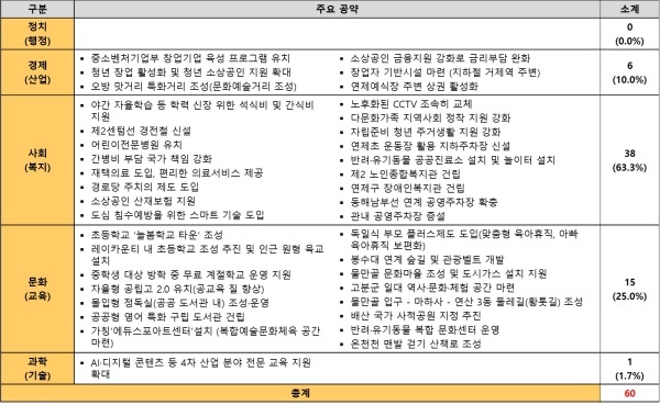 달성 가능성은 4년 임기 내에 완료할 수 있는지를 평가하며 어린이전문병원 유치, 도심 침수예방을 위한 스마트 기술 도입, 마을버스 준공영제 실시, 공공형 영어 특화 구립 도서관 건립 등을 분석했다.