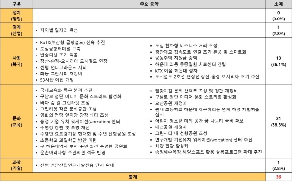 사회(복지) 공약은 △BuTX(부산형 급행철도) 신속 추진 △도심공항터미널 구축 △센텀 언더그라운드 시티 △도심 친화형 비즈니스 거리 조성 △공동주택 지원금 증액 △도시철도 2호선 연장선 장산-송정-오시리아 조기 추진 등 13개다.