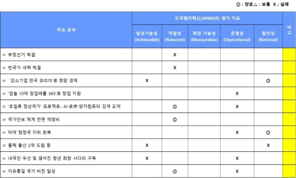 황교안의 공약을 국정연이 개발한 갑옷(ARMOR), 즉 달성 가능성(Achievable)·적절성(Relevant)·측정 가능성(Measurable)·운영성(Operational)·합리성(Rational) 지표를 적용해 평가했다. 간략한 내역과 개선방안을 정리하면 다음과 같다.