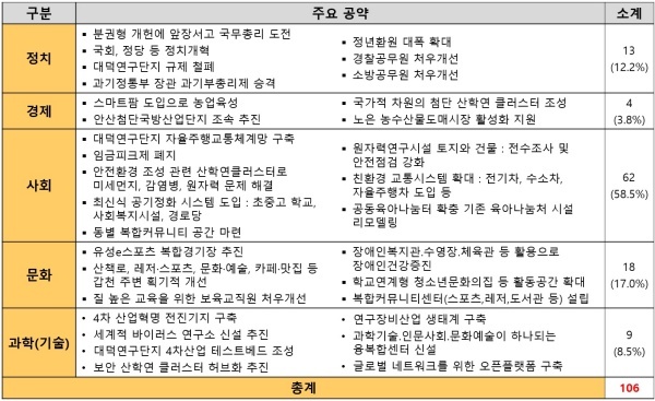 공약은 정치(13)·경제(4)·사회(62)·문화(18)·과학기술(9)로 구성됐으며 사회 공약이 전체의 58.5%를 차지했다. 다음으로 △문화 공약 17.0% △정치 공약 12.2% △경제 공약 3.8% △과학기술 공약은 8.5%를 각각 기록했다.요소별 주요 공약은 다음과 같다.