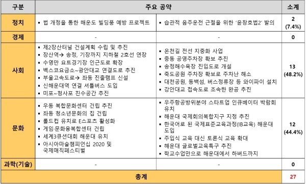 공약은 정치(2)·경제(0)·사회(14)·문화(11)·과학기술(0)로 구성됐으며 사회 공약이 전체의 51.8%를 차지했다. 다음으로 △문화 공약 40.7% △정치 공약 7.4%이며 미래 먹거리인 경제·과학기술 공약은 1개도 없다. 요소별 주요 공약은 다음과 같다.