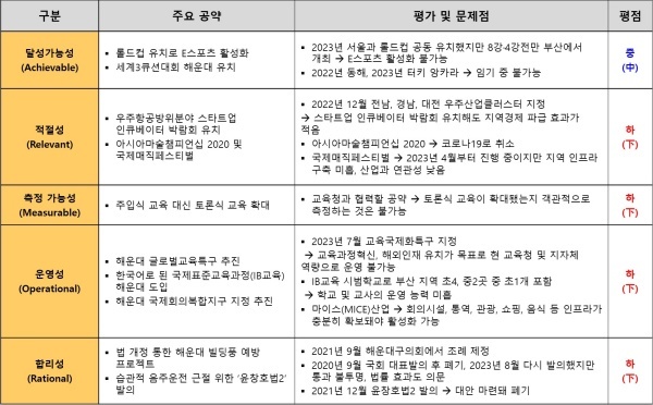 측정 가능성은 공약의 성과를 측정할 수 있는지를 평가하며 하(下)로 분석됐다. 주입식 교육 대신 토론식 교육 확대는 해운대의 초중고등학교에서 지금은 토론 수업을 얼마나 하고 있는데 공약을 통해 얼마로 늘리겠다는 등에 대한 구체적인 실행 방안이 없다.
