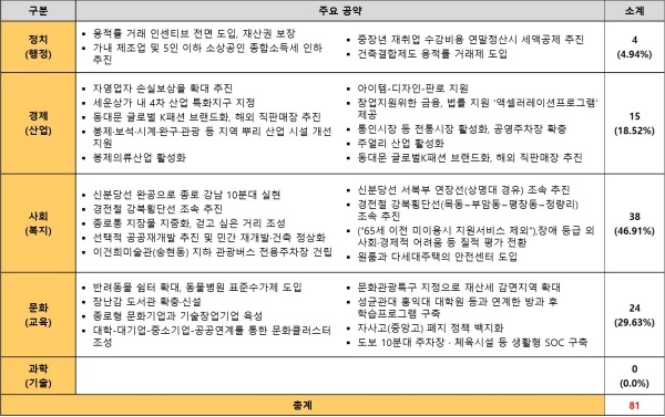 공약은 정치(행정)(4)·경제(산업)(15)·사회(복지)(38)·문화(교육)(24)·과학(기술)(0) 등으로 구성됐으며 사회(복지) 공약이 전체의 46.91%를 차지했다. 다음으로 △문화(교육) 공약 29.63% △경제(산업) 공약 18.52% △정치(행정) 공약 4.94% △과학(기술) 공약 0.0%를 각각 기록했다. 요소별 주요 공약은 다음과 같다.