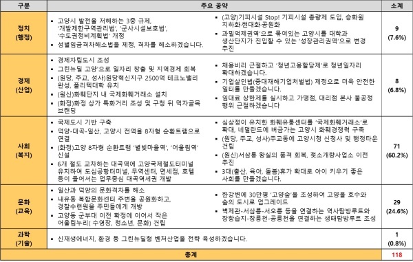 공약은 정치(행정)(9)·경제(산업)(8)·사회(복지)(71)·문화(교육)(29)·과학(기술)(1) 로 구성됐으며 사회(복지) 공약이 전체의 60.2%를 차지했다. 다음으로 △문화(교육) 공약 24.6% △정치(행정) 공약 7.6% △경제(산업) 공약 6.8% △과학(기술) 공약은 0.8%를 각각 기록했다. 요소별 주요 공약은 다음과 같다.