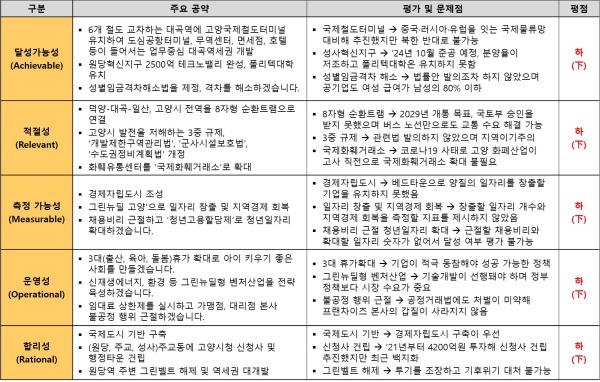 달성 가능성(Achievable)의 측면에서 살펴보면 6개 철도가 교차하는 대곡역에 고양국제철도터미널을 유치하여 도심공항터미널, 무역센터, 면세점, 호텔 등이 들어서는 업무 중심 대곡 역세권 개발을 공약했다. 문재인정부에서 중국·러시아·유럽을 잇는 국제물류망을 대비해 추진했지만 북한의 반대로 불가능헤쟜다. 대북 강경정책을 펼치고 있는 윤석열정부에서는 꿈도 꾸지 못하고 있다