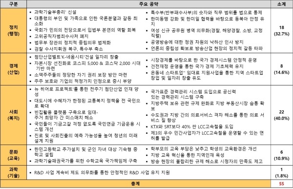 공약은 정치(행정)(18)·경제(산업)(8)·사회(복지)(22)·문화(교육)(6)·과학(기술)(1) 등으로 구성됐으며 사회(복지) 공약이 전체의 40.0%를 차지했다. 다음으로 △정치(행정) 공약 32.7% △경제(산업) 공약 14.6% △문화(교육) 공약 10.9% △과학(기술) 공약 1.8%를 각각 기록했다. 요소별 주요 공약은 다음과 같다.