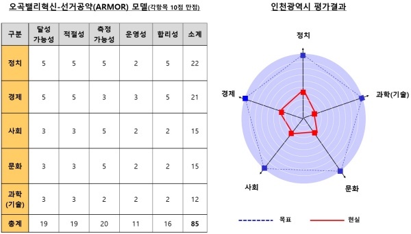 종합적으로 유 시장의 선거공약은 4년 동안 101개를 충실하게 이행해도 250점 만점에 85점으로 달성률은 34.0%에 불과하다. 인천시의 역량과 주민 이익에 꼭 필요한 공약이 포함됐는지를 평가는 운영성·합리성이 낙제점을 벗어나지 못했다.
