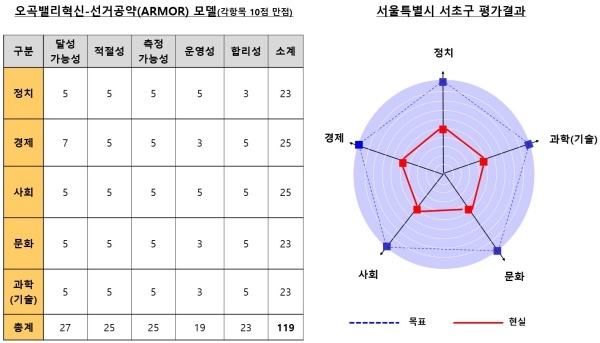 ▲ 서울시 서초구의 ‘오곡(五穀)밸리혁신(5G Valley Innovation)-선거공약’ 모델의 평가 결과[출처 = iNIS]