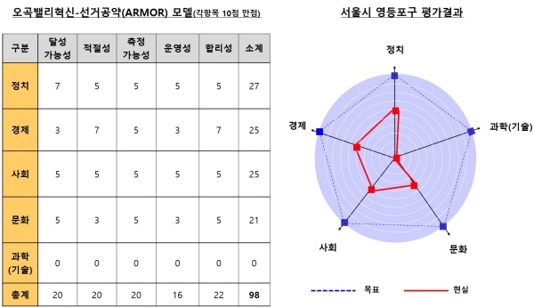 다섯째, 합리성은 공약이 주민자치를 실현하고 주민의 이익을 극대화하는데 도움이 되는지 파악하기 위한 목적이며 22점을 받았다. 여의도를 디지털 국제금융 중심지로 육성하거나 준공업지역을 지식산업 메카로 조성하겠다는 경제 공약은 지역의 경제 여건과 부도심이라는 특성을 감안하면 바람직한 공약이다.