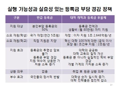 ▲ 반값 등록금 정책과 등록금 완전 후불제의 비교