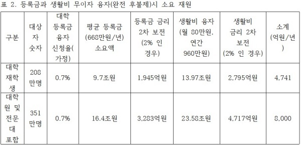 - 졸업 후 약 5년 내에 취업이 된다고 가정하면, 5년차부터 상환이 되므로 원금은 23.67조원에서 39.98조원이 소요되며, 이에 대한 금리 2차 보전을 할 경우 연간 8000억 원(2% 확정 국채 금리)에서 1.6천억 원(4% 보장)이 소요됨