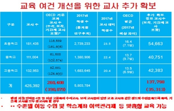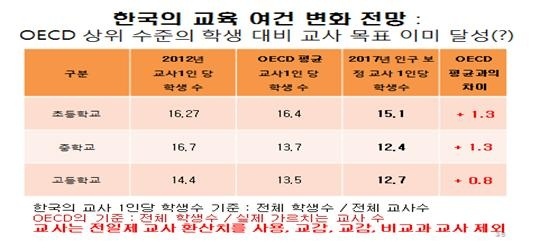 OECD 수준으로 맞추려면 13만7000명 추가로 채용해야, 교사 확충으로 교육의 질 개선과 더불어 창의적 교육으로 사교육 시장 견제 가능