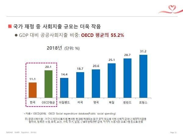 - 우리나라는 OECD의 다른 나라들이 GDP 대비 사회복지 지출을 약 20.1%를 할 때 우리나라는 그 절반 수준인 11.1%를 배당하고 있습니다. 지금은 코로나19 때문에 약간 더 증가하여 약 12.1% 수준이 되었습니다.