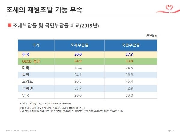 - 우리나라의 국민부담율은 27.3%로 OECD의 다른 나라 평균(33.8%)과 비교할 때 GDP 대비로 6.2%가 낮고, 조세 부담률은 20.0%로 약 4.9%가 낮습니다.