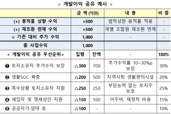 - LH나 SH 등의 공기업은 이사업을 통해 개발 이익을 남기지 못하도록 하여 공익적인 개발이 되도록 하는 방식입니다. 예를 들어 약 1,000억 원의 개발 이익이 남는 사업이라면, 투지 소유자는 300억원의 이익을 가지고, 지역의 주민 편의 시설인 생활 SOC확충에 200억원을 사용하고, 부담능력이 없는 특수 소유자나 세입자 및 영세상인, 드리고 공공자가 임대 주택 등에 500억원이 투자되는 구조입니다.