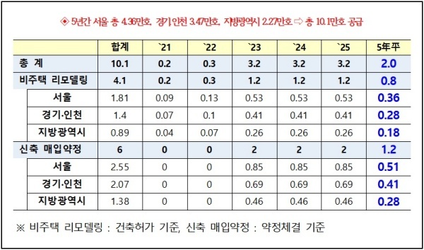 - 또한 비주택 리모델링과 신축매입약정 확대 등의 단기 공급확대 방안으로 5년간 10만호 이상을 신규 공급합니다.