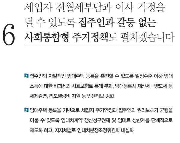 - 예를 들면 전세나 월세를 들어서 이사를 오면, <확정일자>를 받기 위해 동사무소에 방문하는데 이때 전세와 월세가격을 등록하도록 하고, 등록된 금액에 대해 세입자나 건물주에게 공제나 세금혜택을 주도록 하면 자연스럽게 현재의 전월세 가격이 확인이 되고, 이를 기초로 4년 후 재계약할 때 5%의 한도 내에서만 인상을 할 수 있도록 보장을 하면 안정적으로 세입자 보호가 가능할 것입니다.
