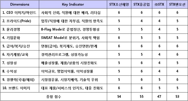 STX조선해양은 STX중공업에 비해 성장성, 수익성, 경쟁력 측면에서 떨어졌지만, 프라이드, 기업문화는 우수하다. STX팬오션은 성장성, 수익성, 브랜드 이미지 차원(dimension)에서 STX중공업에 비해 열세다.