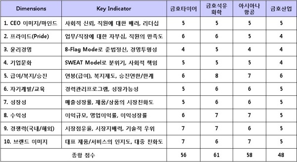 금호타이어는 한국타이어에 이어 국내 시장점유율 2위 기업이지만, 세계적인 경쟁력을 확보하지는 못했다. 금호타이어는 자기계발/교육, 성장성 차원의 점수가 낮았다. 타이어산업 자체가 전문기술보다는 대규모 설비투자로 인한 장치산업이라는 점이 감안됐다. 금호산업은 도급순위 16위의 건설업체로 성장성, 수익성, 경쟁력, 브랜드 이미지 등 대부분의 영역에서 낮은 평가를 받았다.