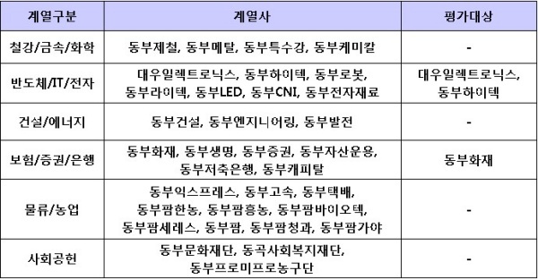 ▲ [표1. 동부의 주요 계열사와 평가대상]
